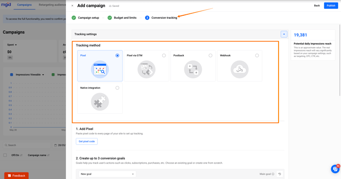 Conversion tracking can be managed in MGID Ads within the campaign setup process. To enable it, create a new campaign or open an existing one and click the edit icon to adjust the settings.