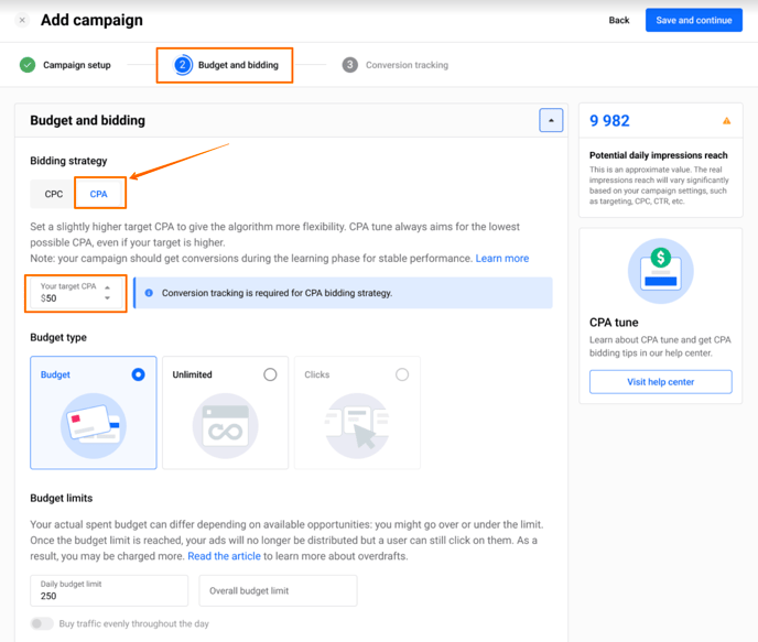- During campaign setup, open Budget and limits. Under the Bidding strategy, click CPA to activate CPA Tune.