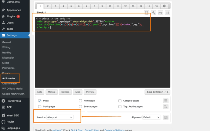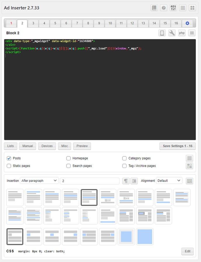 2) Ajoutez la partie BODY du code du widget MGID dans la section de placement du code du plugin Ad Inserter :