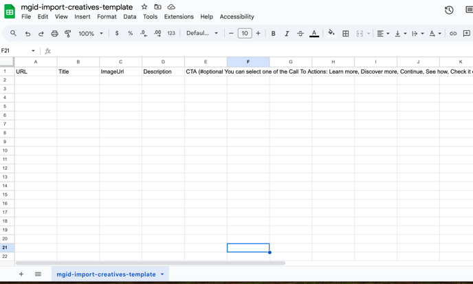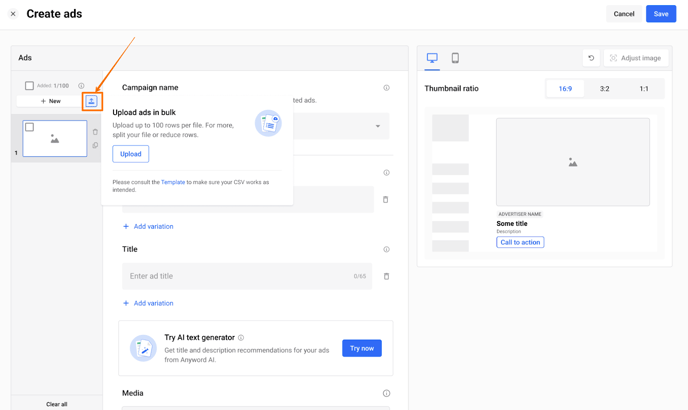 To create new ads in the system, you can use the bulk upload functionality. Each file can contain up to 100 rows. If you need to upload more than 100 rows, please split your data into multiple files.
