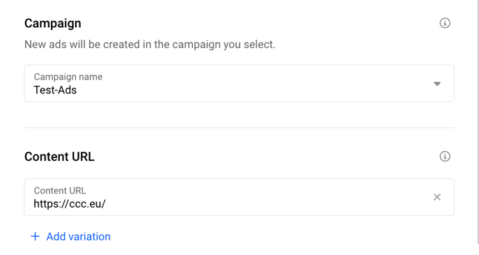 - Campaign name: Choose a campaign name for creatives from the dropdown list. Select the campaign where you want to create the ad.