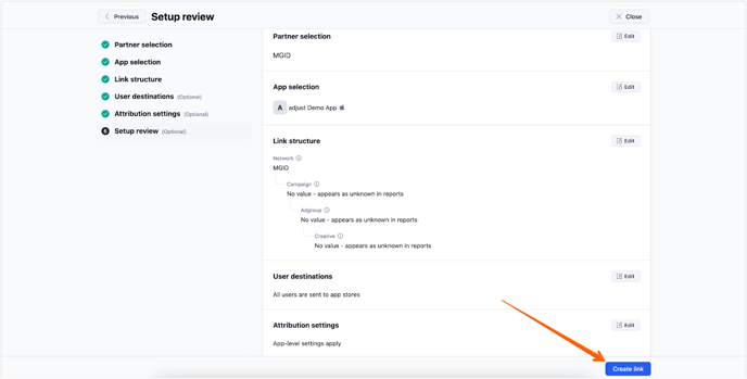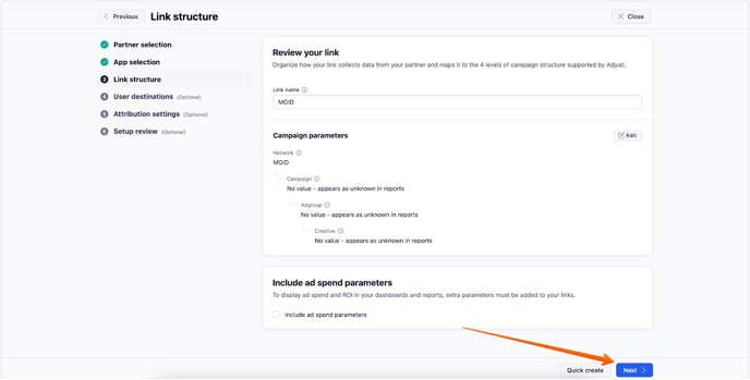 4. Assegnare un nome al link, rivedere tutti i parametri e fare clic su Avanti.
