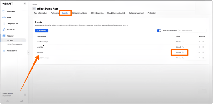 2. Copiare il token corrispondente all'evento che si desidera monitorare.
