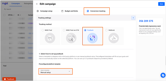 2. Passa alla sezione Conversion tracking. Fai clic sull'opzione Postback nella scheda Impostazioni di tracciamento e seleziona Impostazione manuale dall'elenco a discesa.