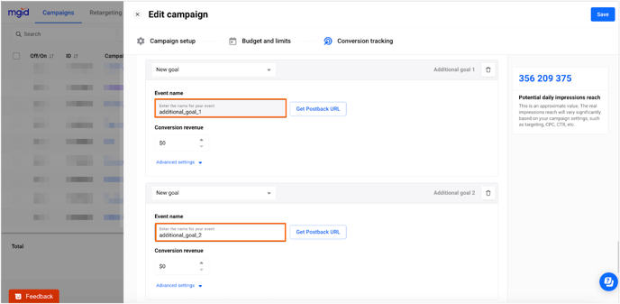 Inizia creando un evento e un URL di postback nel dashboard MGID.