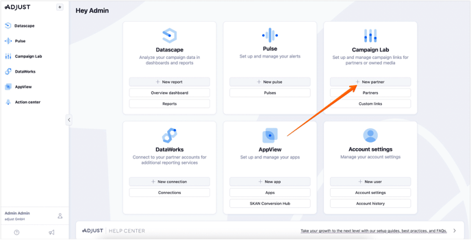 1. Navigare nel Laboratorio campagne del dashboard di Adjust e selezionare Nuovo partner.