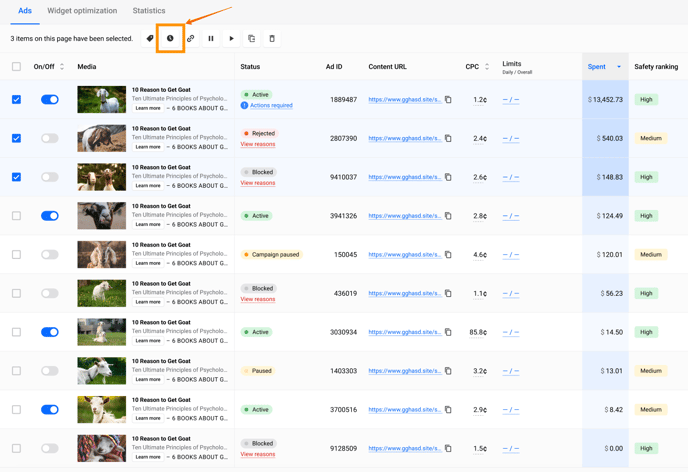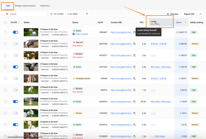 When you navigate to the list of creatives on the MGID Ads dashboard, you'll find a new column labeled 'Limits Daily/Overall.'