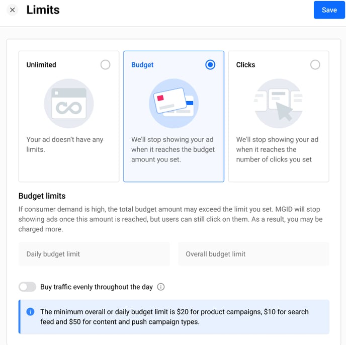 - You can choose between setting a Budget limit or a Clicks limit in their respective tabs.