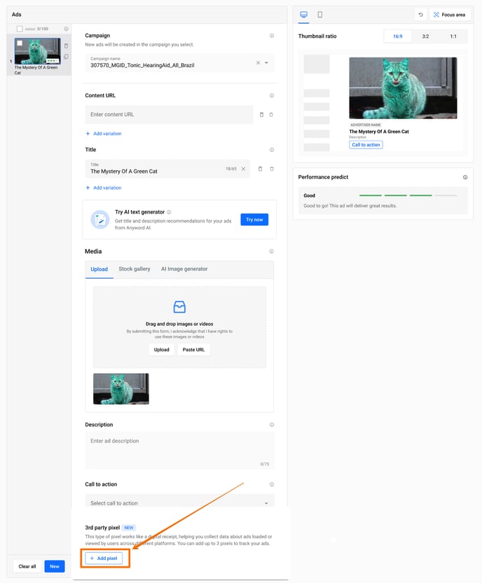 Third-party impression pixel tracking at the creative level allows advertisers to add and manage tracking pixels directly within the MGID Ads dashboard. This feature improves transparency, streamlines workflows and provides complete control over impression tracking.