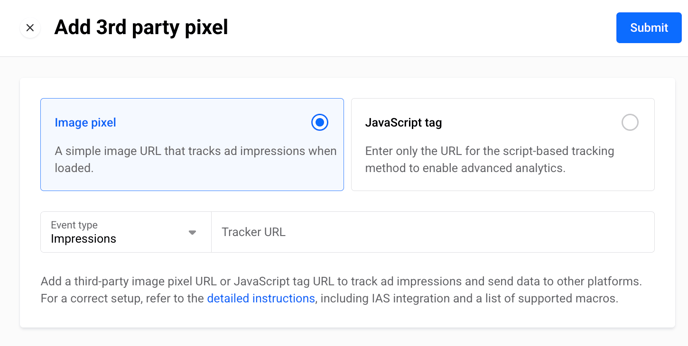 You can add up to three tracking pixels per creative and modify or remove them anytime by editing the ad and using the creative creation form.