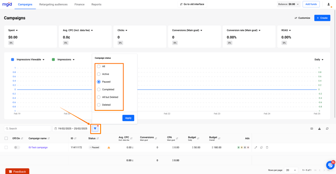 - Delete: If you delete the selected campaign, its ads will be deleted as well. However, you'll still be able to copy the campaign's settings and see statistics.