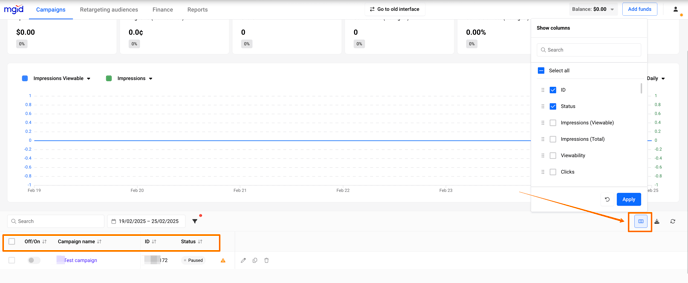 The platform allows for the option to select additional columns to appear within the campaign list. Click the three-lines icon to select additional columns.