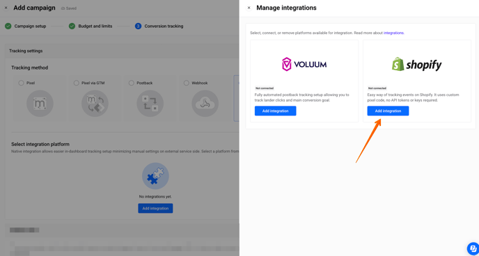 If you already have an existing integration added, click Manage Integrations to add Shopify to your tracking setup.