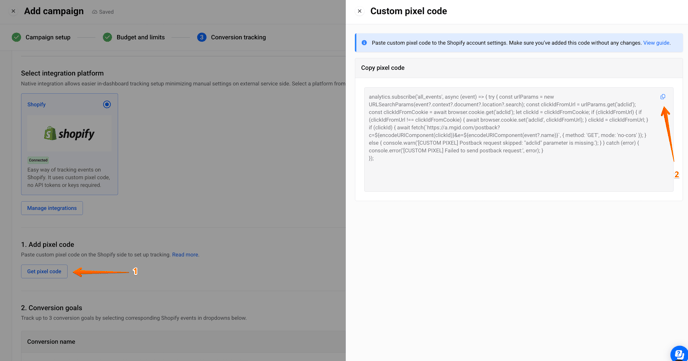Obtain a customized MGID code for Shopify directly from the MGID Ads interface (under the conversion tracking setup step).