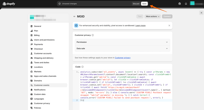 5. Select the Customer Events section and click the Add custom pixel button. Add the pixel name MGID.