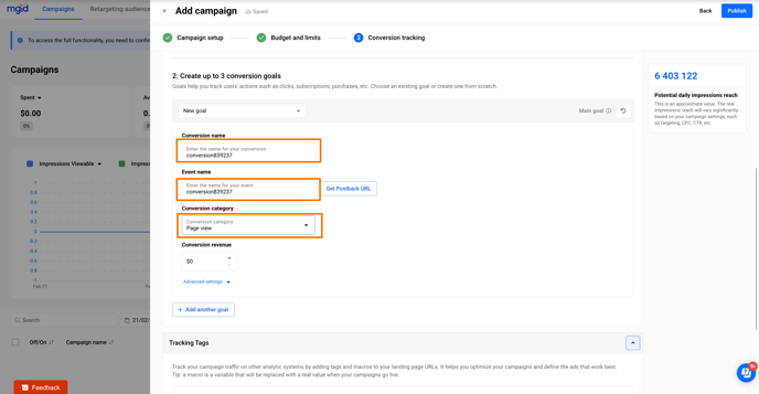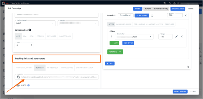 5. Lastly, go to the Campaigns tab, copy the tracking link, and use it to create teasers on the MGID side.
