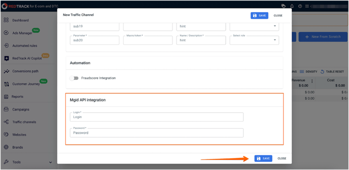 5. Insert login and password from MGID Dashboard into the required fields. You can find this data in the client's account under the Settings section. Press Save.