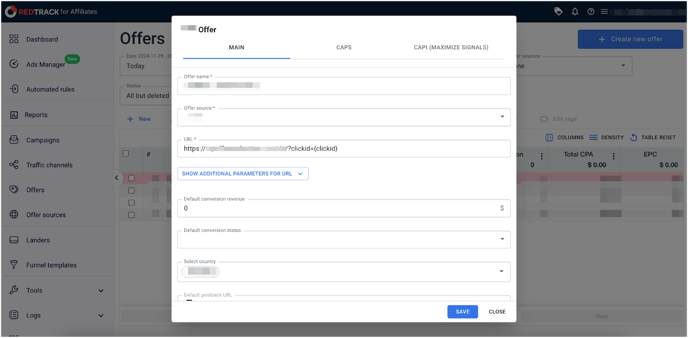 2. Fill in the offer name and insert the offer URL link. It is also required to refer to a parameter in which the internal RedTrack clickid was transferred, e.g., http://yoursite.com?click_id={clickid}.
