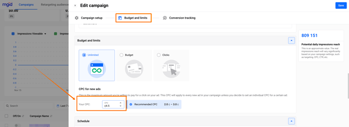 The CPC configuration is an important step, which you can set during the campaign creation process at the Budget and Limits stage. Keep in mind that this CPC will automatically apply to all new ads added to the campaign.