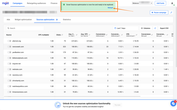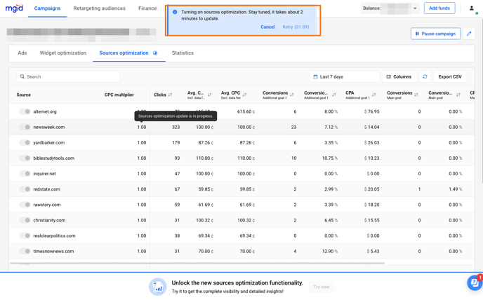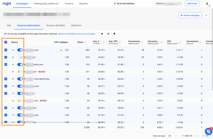 Please note: The Sources Optimization interface is available exclusively in MGID Ads and is not supported in the old legacy dashboard.