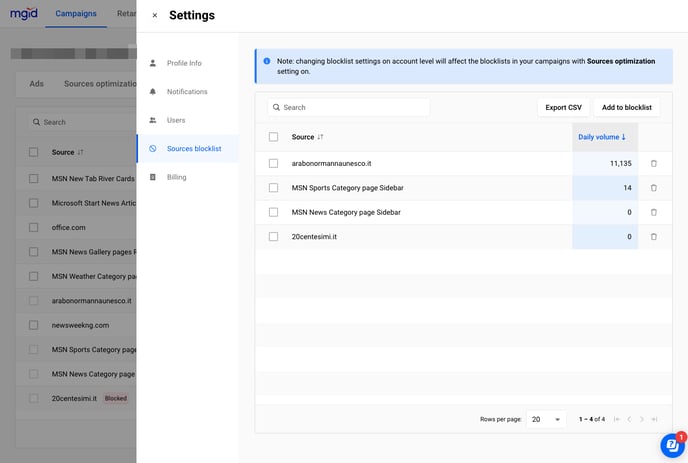 The primary purpose of the Sources Blocklist at the account level is to manage a blocklist that applies to all campaigns with Sources Optimization enabled. Any source blocked at the account level will be blocked across all relevant campaigns.