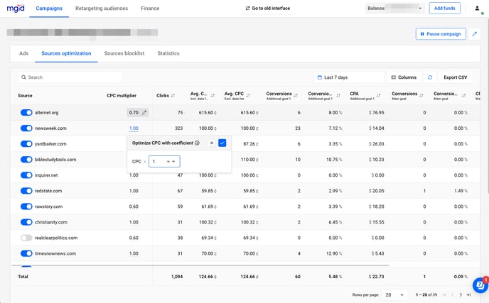 To enhance transparency and give you greater control over your ad campaigns, we're updating our platform. The Widget Optimization tab, which displayed widget UIDs, has been replaced with the new Sources Optimization interface, which shows traffic sources. As a result, all actions—such as viewing statistics, adjusting CPC multipliers and enabling or disabling traffic sources—are now directly connected to these traffic sources, making the entire process more user-friendly and transparent.