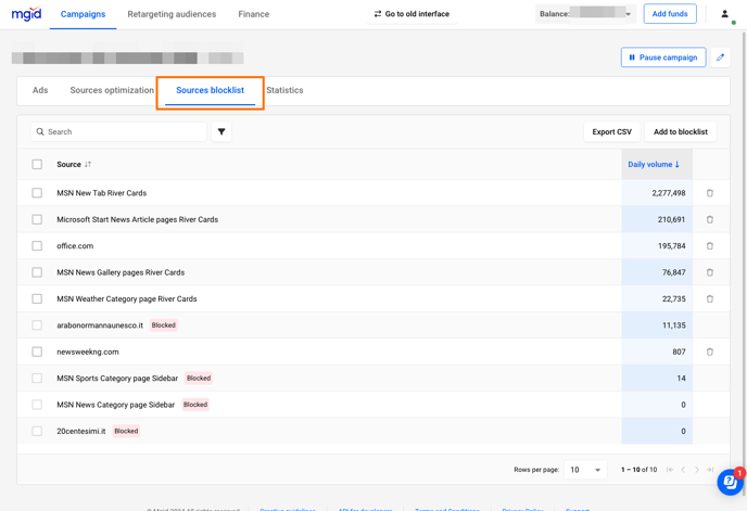 The Sources Blocklist is a powerful tool designed specifically for campaigns with Sources Optimization enabled in MGID Ads. It allows you to manage traffic sources at the campaign level. If your campaign uses the domain-based view, you will have access to the Sources Blocklist interface.