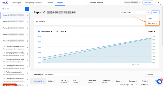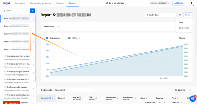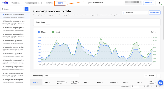 - Navigate to the Reports interface from your MGID Ads dashboard. The interface initially opens with the default template report.